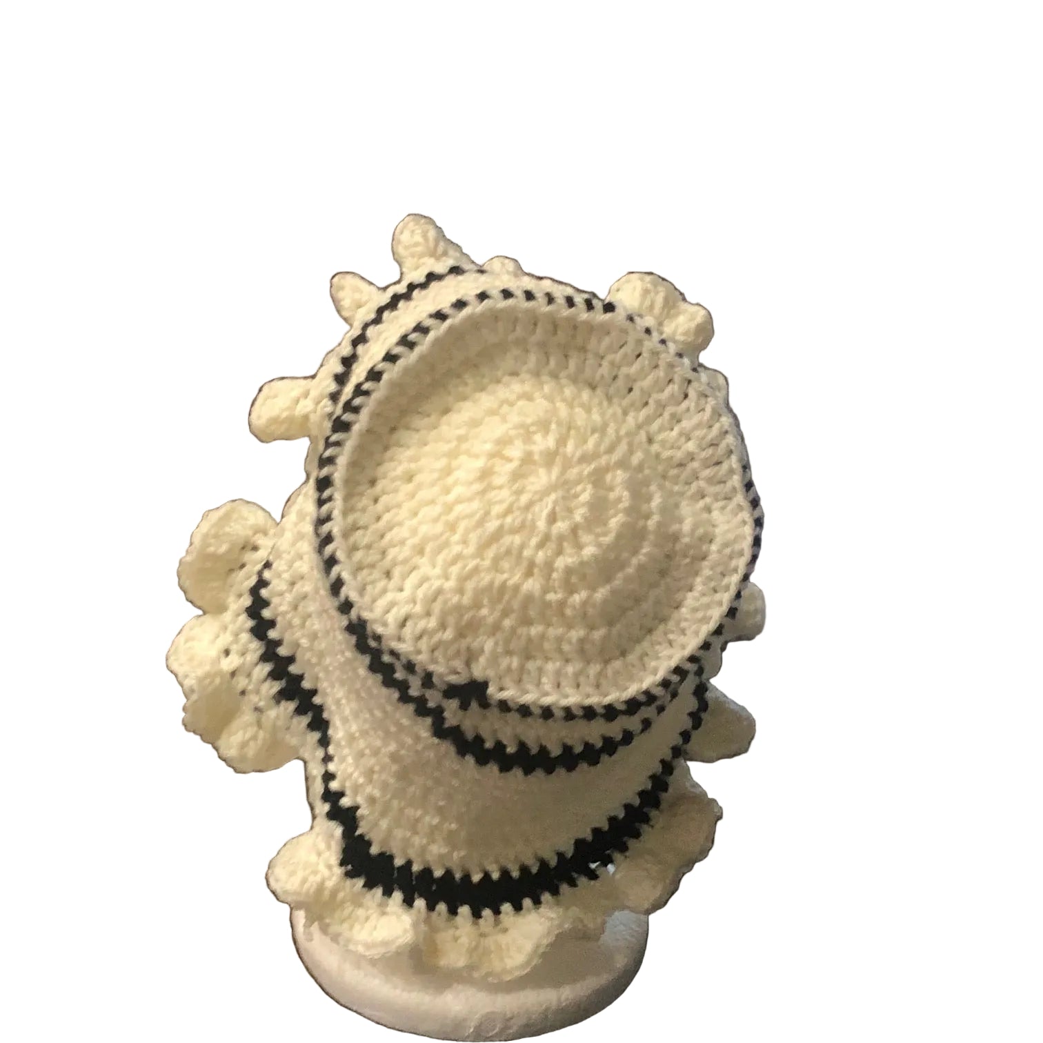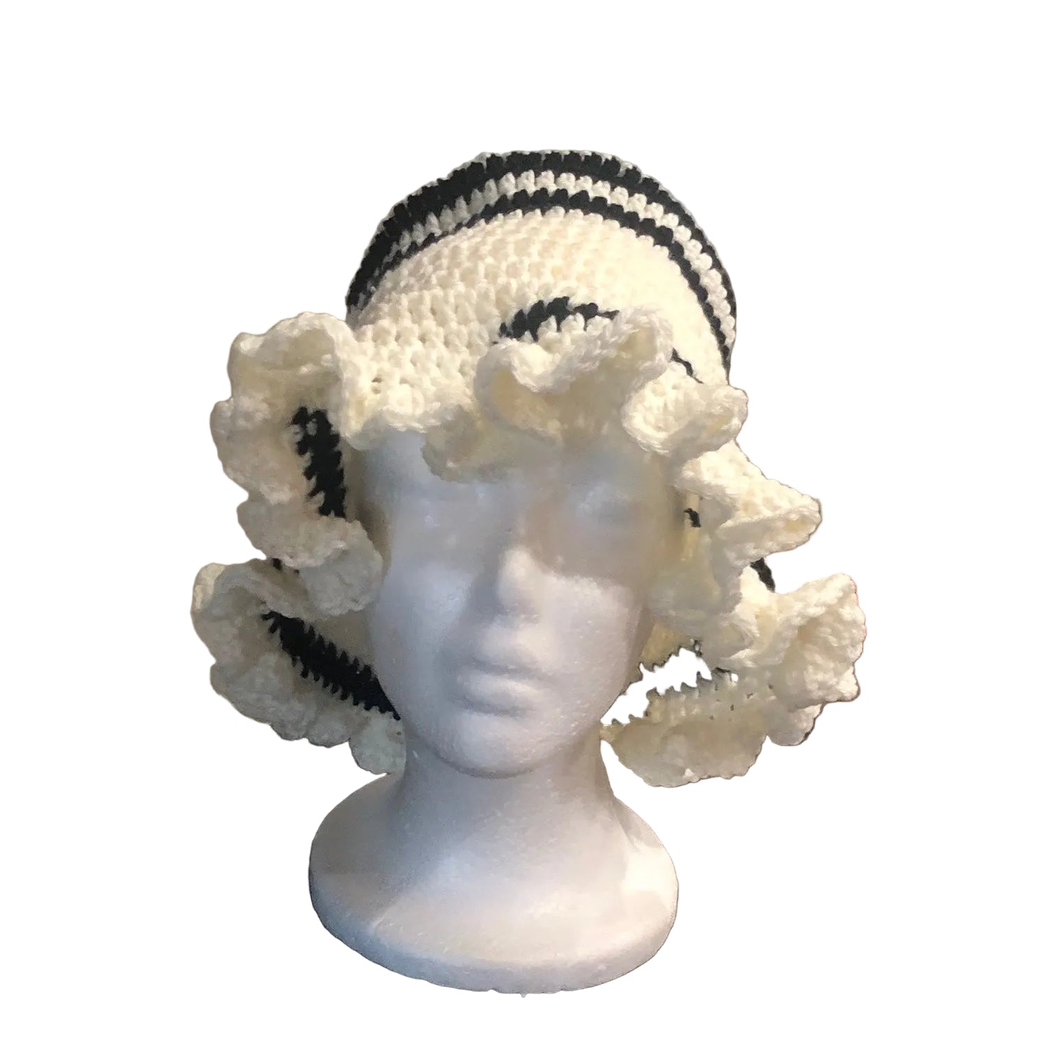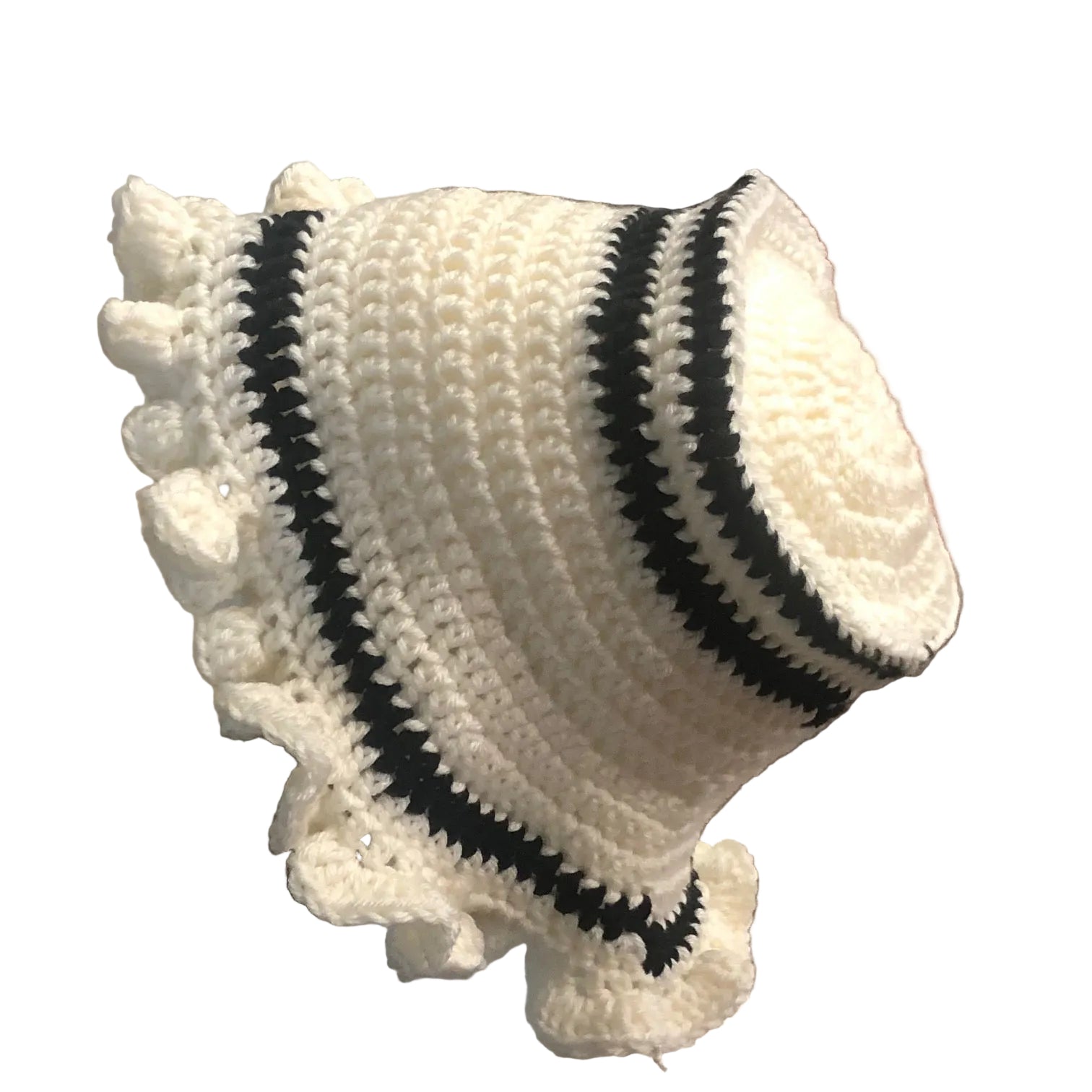 This handmade Medium Ruffle Bucket Hat is a lightweight, breathable fashion item, featuring vibrant Black and White colors.