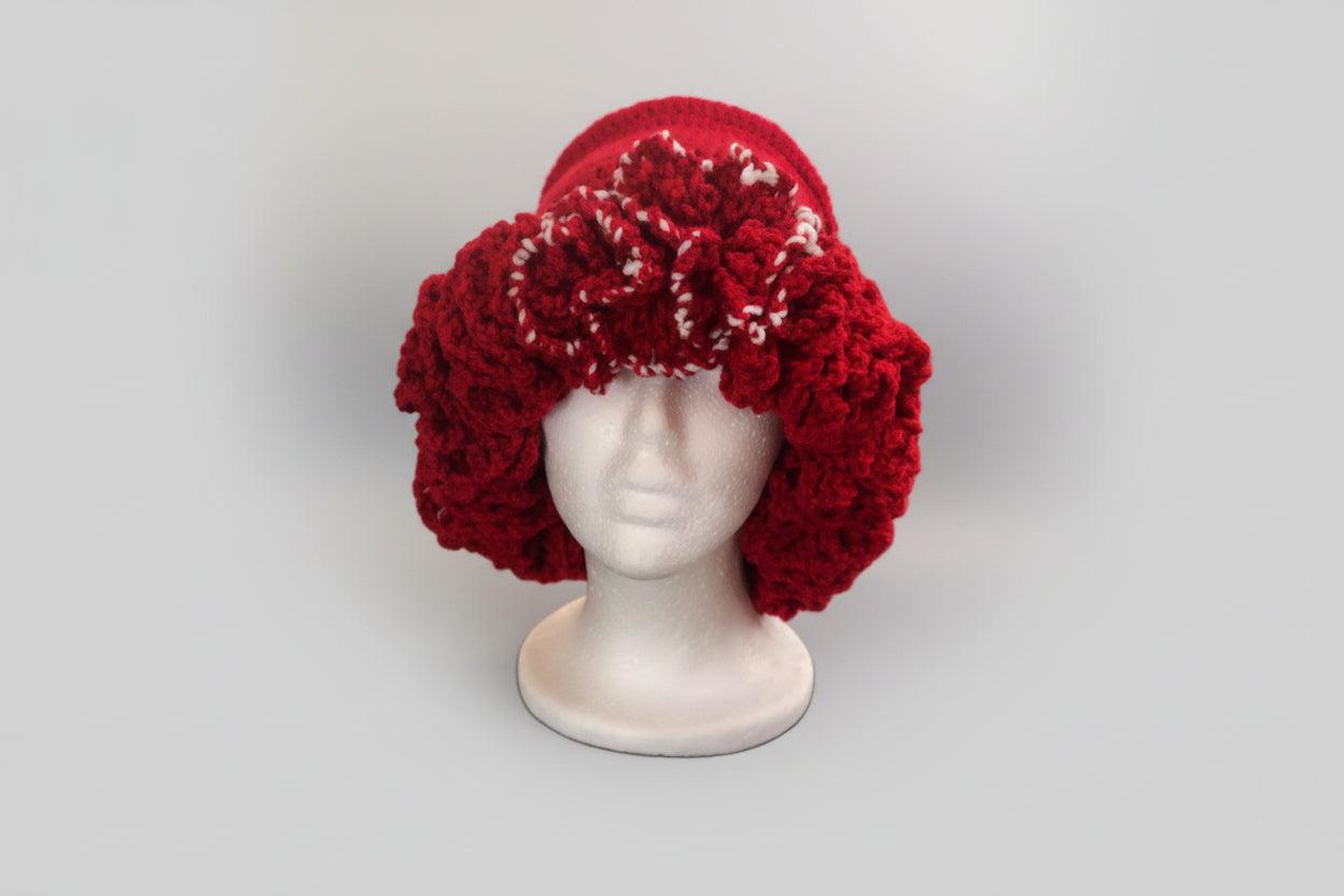 This handmade crochet bucket hat is a lightweight, breathable fashion featuring vibrant Red and White colors and large ruffles.